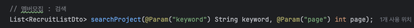searchProject 메서드는 검색어와 페이지 번호를 매개변수로 받아서 쿼리 결과를 RecruitListDto 객체의 리스트로 반환한다.