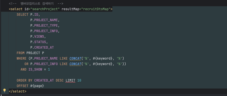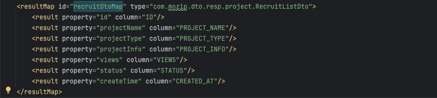 resultMap은 SQL 쿼리 결과를 RecruitListDto 객체의 필드에 적절히 매핑한 뒤 프로젝트 검색에 필요한 쿼리를 작성해준다.
