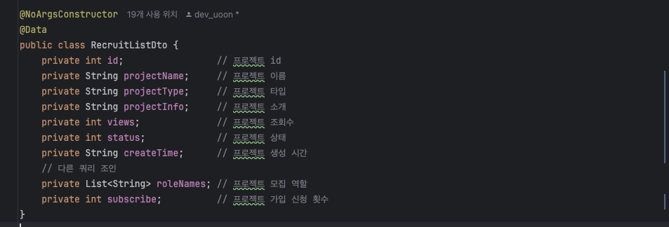 프로젝트 모집 관련 데이터를 담기 위해 정의된 DTO를 작성한다.