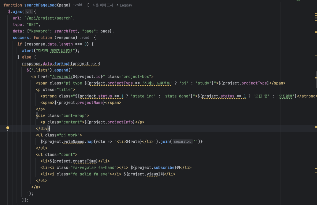 url : '/api/project/search'는 서버의 엔드포인트를 나타내고 HTTP 메서드 유형으로, GET 요청을 사용한다.